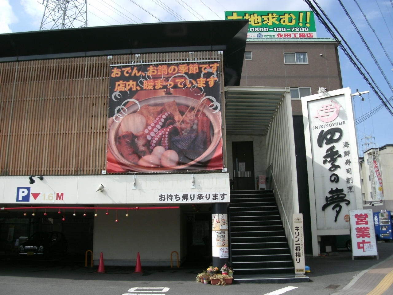 「海鮮寿司割烹 四季の夢」さんは、国道9号線、沓掛口の信号のそばにあります。お店は二階で、下が広い駐車場になっており、入りやすいお店です。店内は天井が高く、おしゃれな雰囲気、カウンターと個室の様な座席があります。海鮮・寿司メインのお店ですが、ステーキや豚カツ、麺類などもあります。お昼に“寿司ランチセット上1260円”を頂きました。汁物は赤だし、あら汁、ミニうどんなどの中から選べるので、“あら汁”をお願いしました。流石に海鮮をメインにしているだけあって、お寿司のネタは新鮮で、寿司6貫、手巻き、たまご、サラダ、あら汁と十分なコストパフォーマンスでした。スタッフの接客がとても快く、楽しく食事できました。