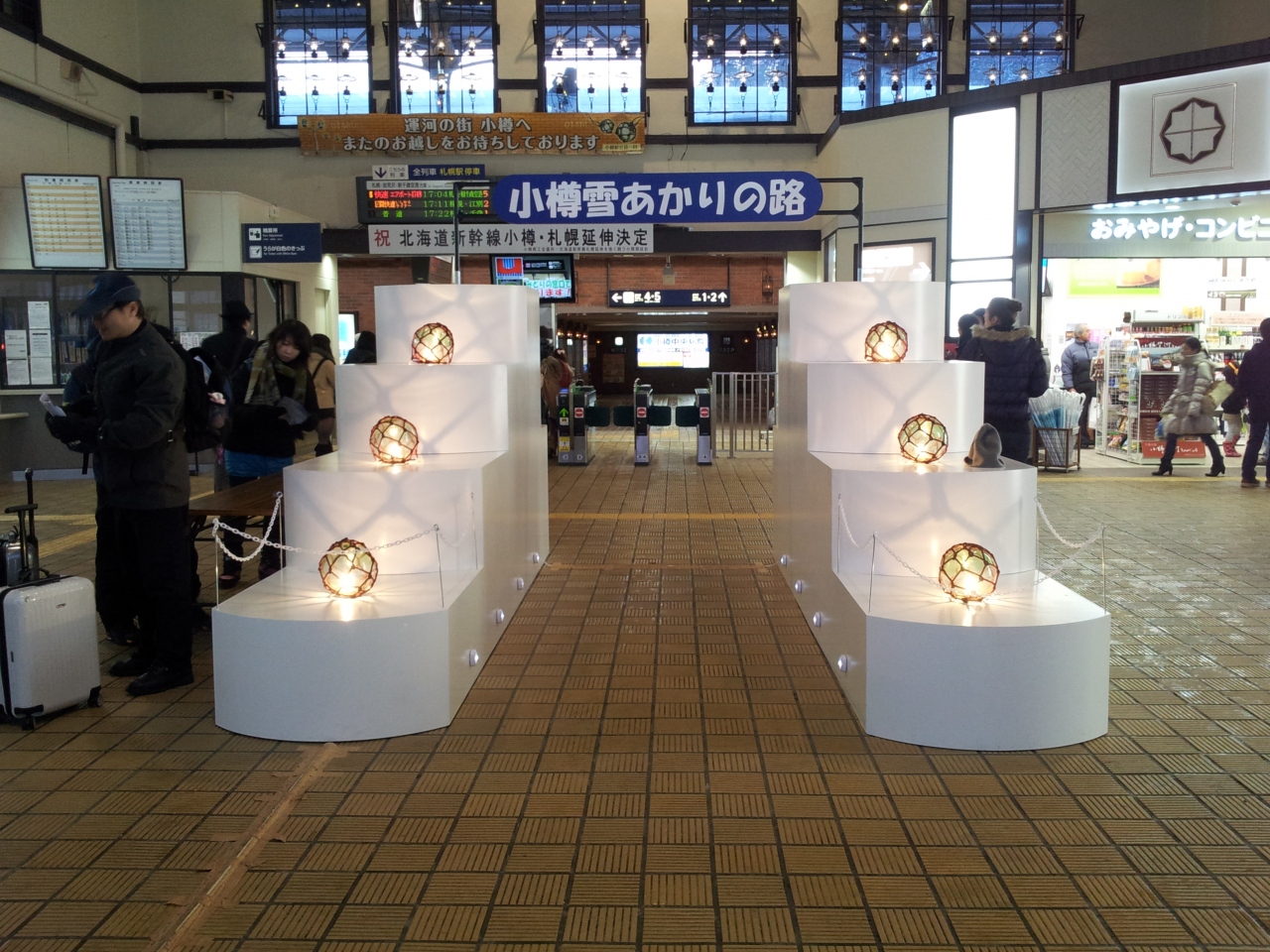 小樽雪あかりの路の開催期間だったため駅の構内にかわいい明かりのオブジェがありました。