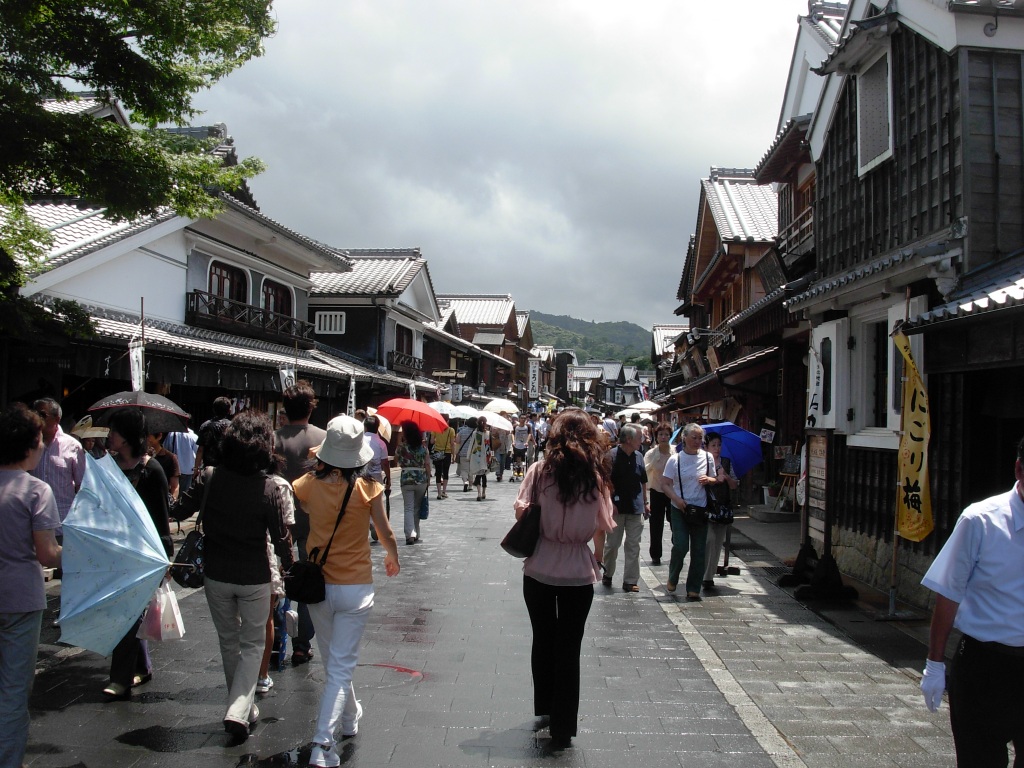 観光で各地の古い町並みは結構、訪れていますが「ここまでやればすごい」と思ったのが伊勢のおはらい町通りです。伊勢神宮内宮の宇治橋へと続く800メートルの通りは、ここはお江戸の時代か映画のセットかと思わせるほど古い家々が延々と続くのです。もちろん、どの家も建っているだけではなく、土産物屋に団子屋、喫茶店、真珠屋さん。あの赤福の本店などもあり、歩くだけで楽しくなってしまいます。伊勢神宮の門前町として成長し、一時期は寂れたこともあったようなのですが、電線の地中化や石畳敷設など観光スポットとしての開発を進めた結果、かつてのような賑わいを取り戻したとか。途中、交差するように「おかげ横丁」も登場してきます。