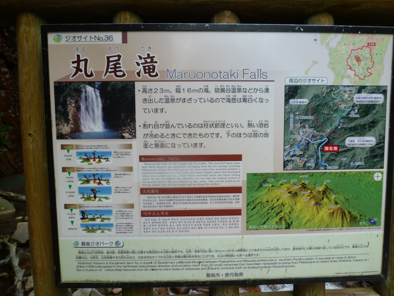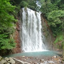 高さ23m、幅16mで温泉が混ざっているので、滝つぼが青白くなっています。