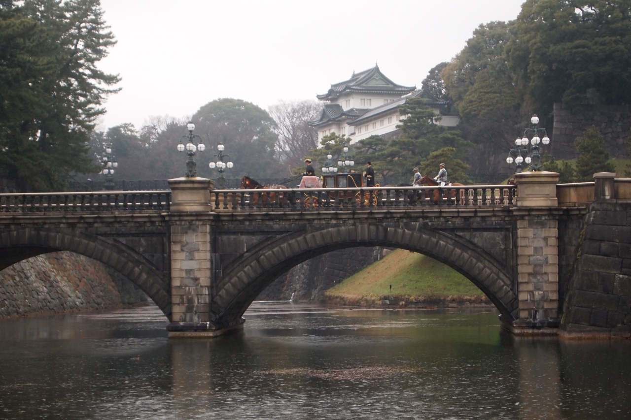 私が行った日は、たまたま外国の大使が皇居に挨拶に行くとのことで馬車で二重橋を渡り、門を通って中に入るのが見られました。