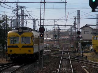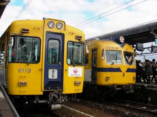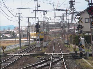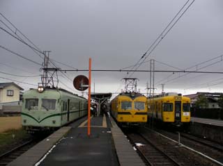 川跡駅は斐伊川のそばにあり、江戸時代には斐伊川が西に流れてた跡で、斐伊川を東に付け替えて宍道湖にそそぐようになりました。川跡駅に近づくと単線の線路が分岐して2面4線になり、隣のホームに大社線の出雲大社前駅行きが停まっていて、反対側から松江しんじ湖温泉行きがやってきて、3つの列車が同時に停車して、大社線に接続しています。