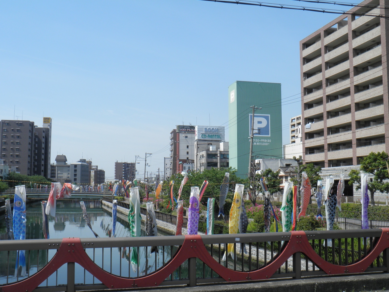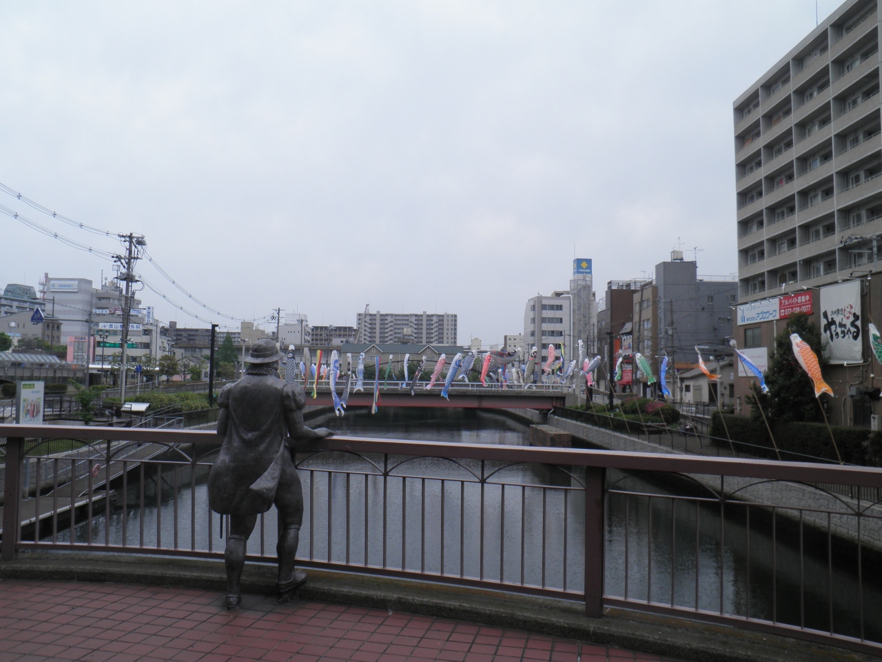 堺駅は堺東駅とはかなり離れています。 堺駅にはレストランやファーストフードなどの飲食店があり、1階のベーカリーのファーストフード店で昼食ととりました。 屋外席もあってのんびりできました。 駅の周りには飲食店がたくさんあります。 駅の裏には海があり、海に流れ込む川もあって、こいのぼりが空を泳いでいました。 川にかかる橋にはオランダ人の像なんかがありました。
