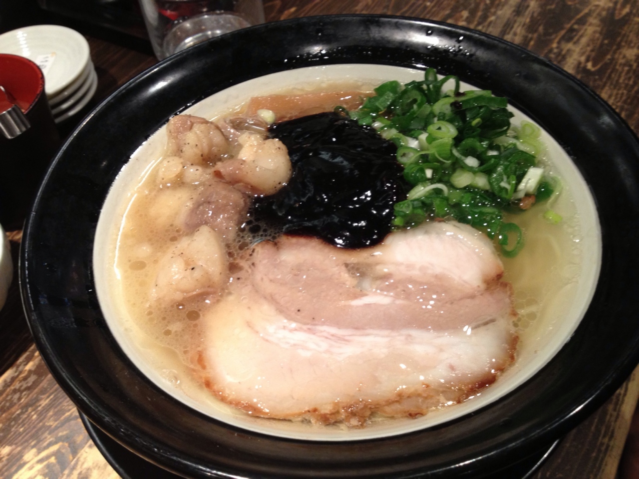 ラーメンを決める時に大阪ブラックと普通の醤油ラーメンにしようと思っていたのに、もひとつなにわブラックというのを頼んでしまいました。結果、大阪ブラックはうまーい!と思ったのですが、なにわブラックはからーい(醤油味が濃い)ということで少し残念でした。普通の醤油ラーメンにすればよかった…。今までは醤油ラーメンは興味なかったけど見直しました。