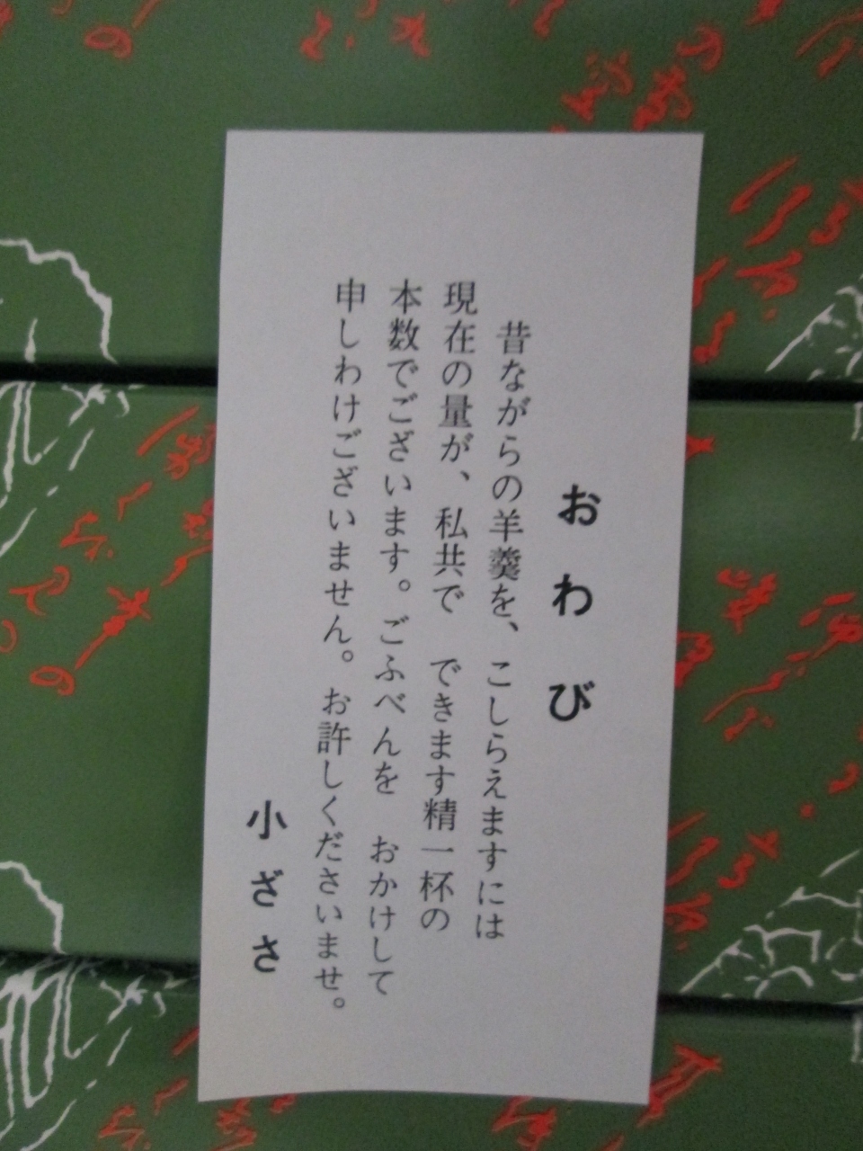先日、行列に再度並び羊かんを購入しました。整理券を配布する朝8時15分頃には定員の50名に達していました。購入する際、最中も買ってみました。最中は限定品ではないのでお店の開店10時からでも購入できます。