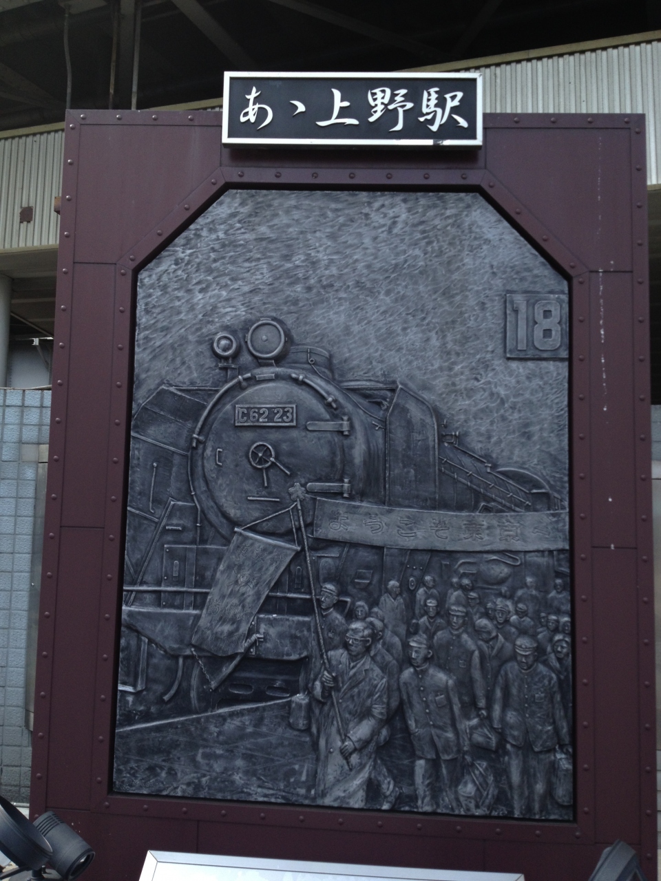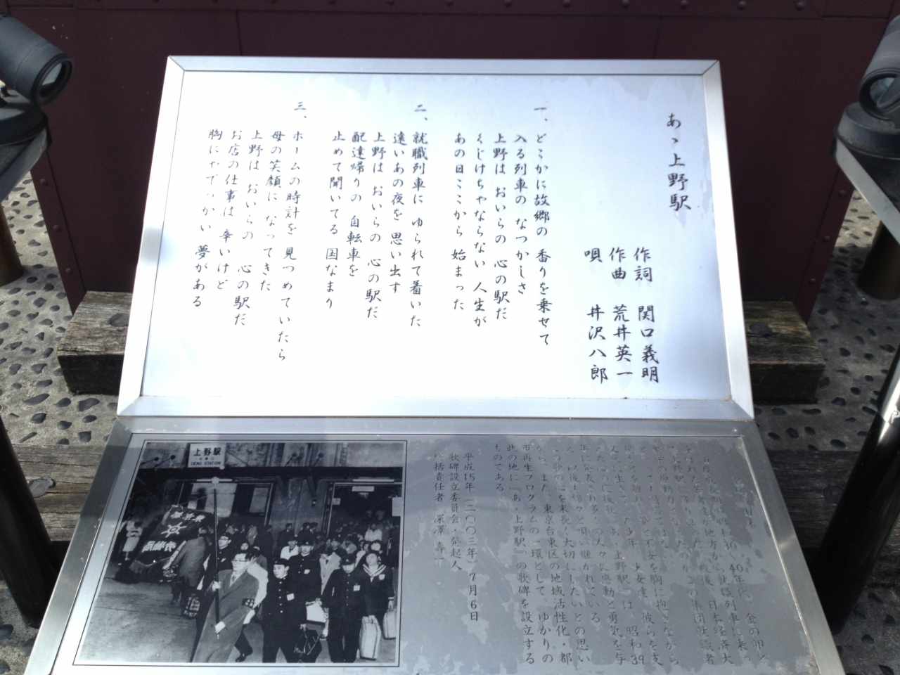 上野駅の広小路口を出て左寄りに行くと、ガード下の手前にあります。2003年、元プロボクサーのファイティング原田さんや集団就職で上京した中小企業経営者らによる有志団体によって建立されたそうです。歌碑は高さ2.6メートルあり、結構大きいです。時代を感じます。