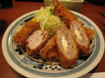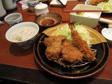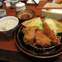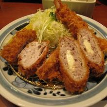 私はエビフライと薄切り肉をチーズで巻いたもの、とミルフィーユ状態の豚肉の3種類盛りを選びました。