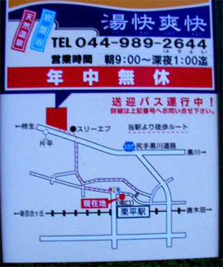 小田急多摩線の栗平駅の南口から、駅前の道路を渡った先の階段を降りて、左折して高台の住宅地を進み、川沿いの谷に向かって急坂を下った先の広い道路を左折して、コンビニの先に、徒歩10分ぐらいでくりひら温泉湯快爽快くりひらがあります。マリンブルー多摩の帰りに唐木田駅からの電車を栗平駅で降りて行ってきました。