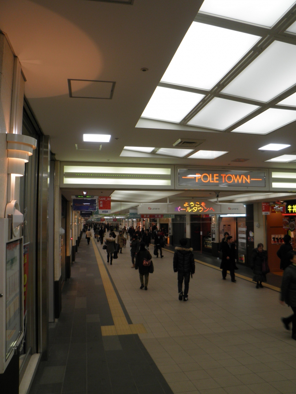 札幌地下商店街には、主にオーロラタウンとポールタウンがあります。 ポールタウンは大通りとすすきのの地下をむすぶ商店街で、途中で狸小路商店街のアーケードにも上がれます。 北海道の冬は長く厳しいので、屋内のショッピング街は休日にたいへん混雑します。すすきの駅の近くに牛どんのすき屋があるから安くあげたいときにはええよ。