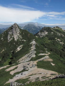 尖っていて格好良い山です。手前に前烏帽子岳がありここから烏帽子岳の岩峰が、その後ろに立山連峰がきれいに見えました。今回は晩夏に訪れましたが、秋の紅葉が美しい感じなので、その頃再訪したいと思っています。