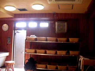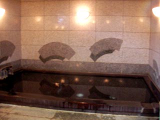 バスタオルと手拭を借りて、フロントの前にあるダイヤル式のセイフティボックスに貴重品を預けてから、新館の廊下を通って一番奥が浴室で、前回は大理石の「福の湯」でしたが、今回は古代檜漆塗り「檜の湯」で、スベスベ感のある黒湯が湯船にはられています。浴室は窓がなく、蒸し暑いのが難点ですが、カランで水を浴びて何度か入って、冷房の効いた脱衣場にあるマッサージチェアでしばらく休憩して、再び黒湯に入りました。