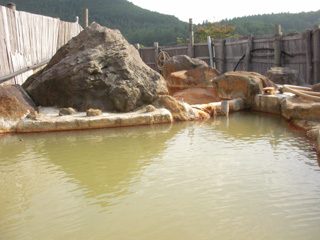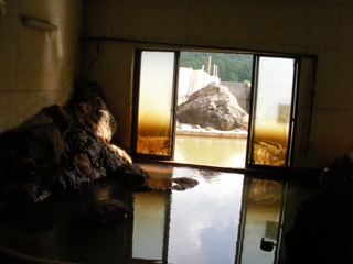 浴室に入ると正面の岩風呂の内湯からそのまま露天風呂につながっていて、70度を越える源泉が岩の上から掛け流されていますが、内湯は激熱で、露天の一角に冷たい水が注がれているところが、熱いですが入れます。温泉の成分は、カルシウム分を含んでいるので、源泉が流れたところは鍾乳石のようで、鉄分を含むので酸化して赤くなっています。露天風呂の奥のもう一段下に湯船があり、ここまで湯を引けば適温になりそうです。
