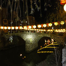 中島川には短い区間にたくさん橋が架かってる感じでしたが、眼鏡の形はここだけのようです。日本で最初の石造りのアーチ橋とか、ランタンフェスティバルの会場にもなっていました。趣ある橋で昼もランタンが飾られて綺麗でしたが、夜の方が幻想的な雰囲気で素敵でした。