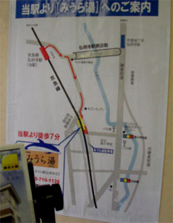 京急川崎駅で、品川発の快速特急8両と、羽田空港からの4両が併結されて12両になり、クロスシートの快適な列車は、弘明寺駅には停まらないので、次の金沢文庫駅まで乗って一駅引き返します。弘明寺駅の改札にある案内を見て、アーケード商店街の入り口を右折して、あとは道なりに進むと高架の下にあるみうら湯に着きました。