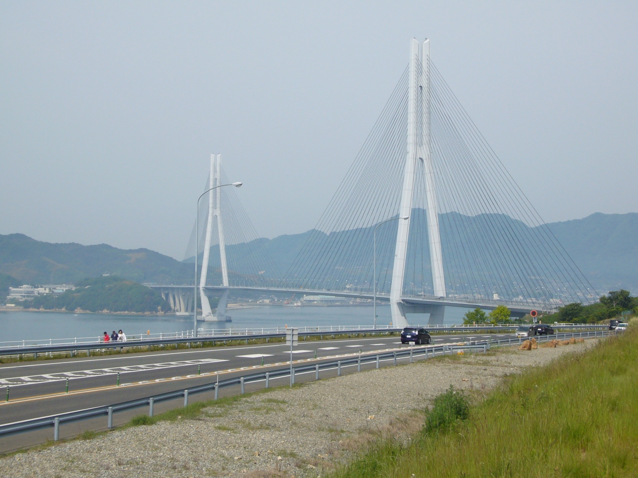 正式名称は西瀬戸自動車道、一般には、公団が公募した愛称「しまなみ海道」と呼ばれ、本州四国連絡道路の尾道・今治ルートを成す道路。これもまた、どこかの政治家が対四国に架けた無駄遣いの象徴。しかし、しまなみ海道で尾道側から最初の島、向島で一番高い山の高見山の頂上から瀬戸内海に無数に散らばっている島々を一望、まるで箱庭を見ている様で素晴らしかった。また、瀬戸内海を自転車で渡ることができるのはここだけらしく、頑張っている人たちが大勢いた。