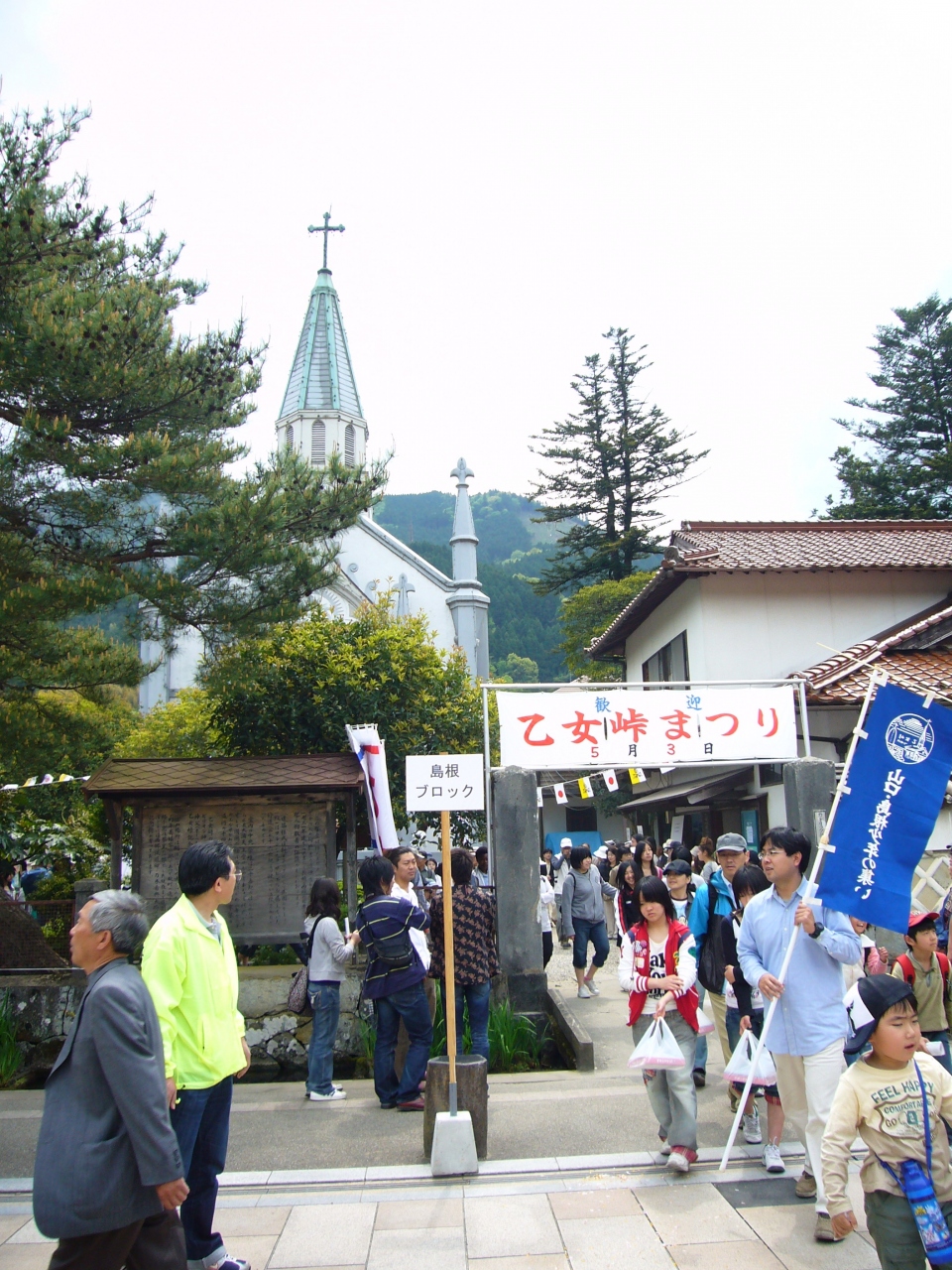 また、明治初め、長崎から流刑された数多くの信者が、拷問や投獄でもその信念を貫き通し、この地で命をおとしたそうな。これらキリシタン殉教者の霊を慰める「乙女峠まつり」が本日5月3日に行われていた。津和野カトリック教会から約2キロ離れた乙女峠を目指して、聖母マリア像を中心に信者の巡礼の行列が続くそうな。