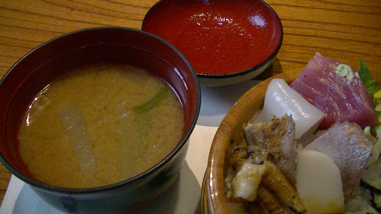 大きなお碗で赤だしも来ました。名古屋だから、辛い味噌汁だろうと思って蓋を取ると、以外に色が薄い。これが赤だし?と、一口飲むと確かに赤だしの味がしましたが、ちっとも辛くありません。関西人の私でも丁度よい濃さでした。