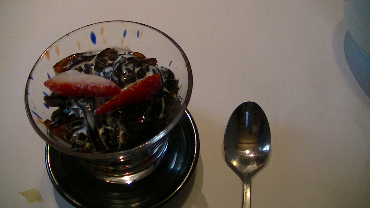 寿司を食べ終わると、コーヒーゼリーのデザートが!この辺りがちょっと不思議です。ところてんのように細切りしたゼリーで、一口目はちょっと甘いと感じましたが、食べ進むうちに丁度良い甘さに。イチゴとりんごの短冊も入っていました。