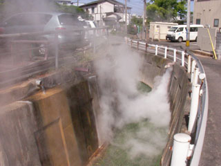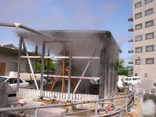 谷の湯から川沿いに進むとホテルの裏手で、温泉を貯めておく装置が何かの工場のようです。上人の湯から続く坂の下に戻ると地獄原温泉がありました。ここも100円で気軽に入れる共同浴場です。ちょっと熱めの温泉に浸かります。