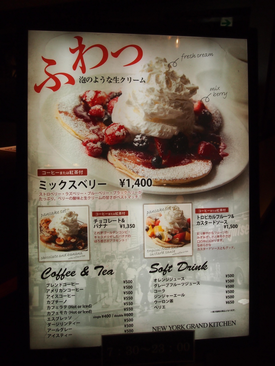 ランチの時間帯が終わると、周りのお客さんがこぞってホイップクリームたっぷりのパンケーキを食べていました。 今、ちょうどパンケーキが流行っているからなのか、このお店が美味しいパンケーキで有名なのか…。 写真を見るだけで甘そう~^^って感じでした。