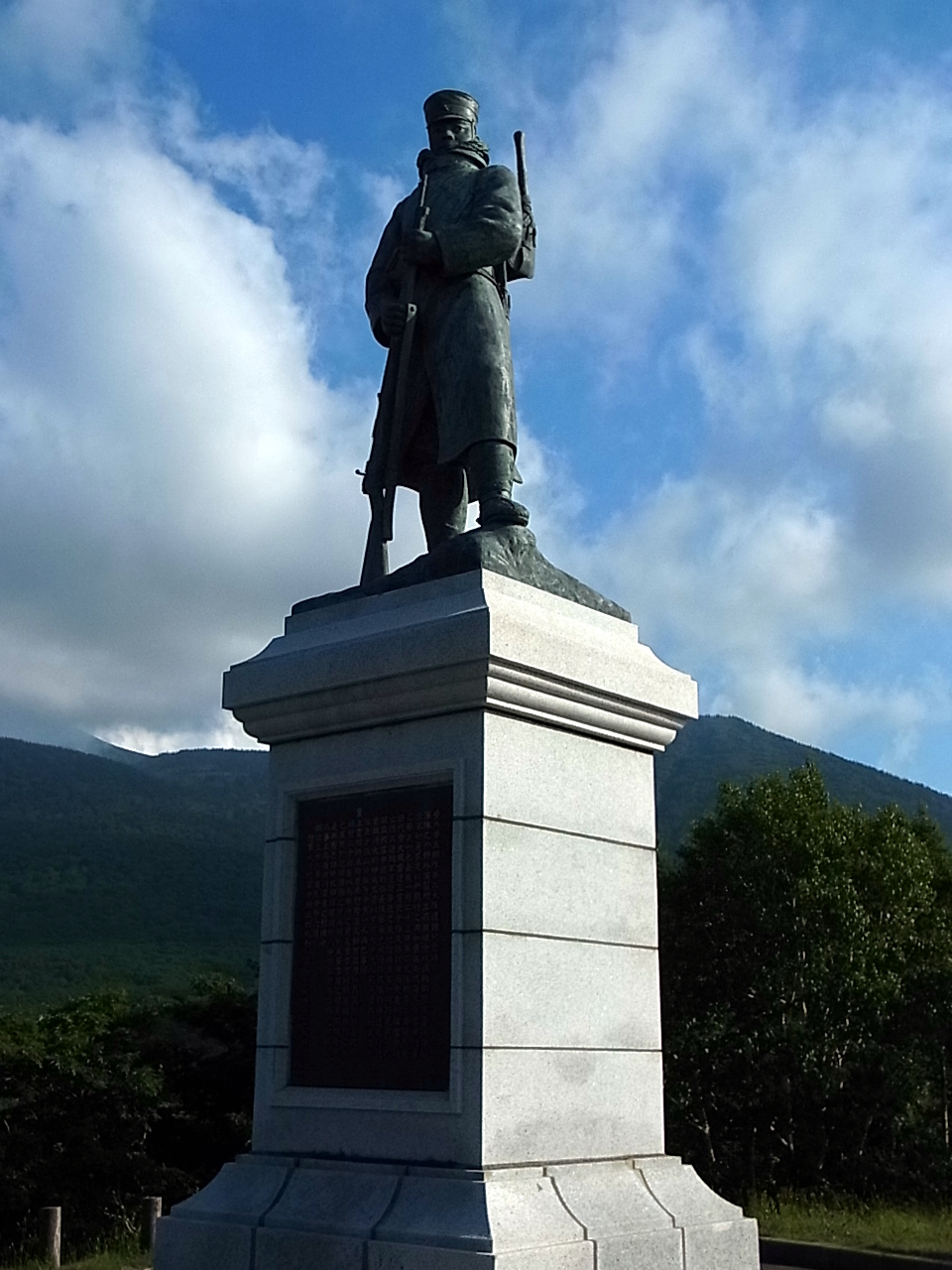 1902年(明治35年)1月に、対ロシアに向けて訓練していた歩兵第5連隊第2大隊210人が八甲田山で遭難した際、雪の中に仮死状態で立つ後藤房之助伍長を捜索隊が発見しましたが、そのときの後藤伍長の姿を銅像にしています。