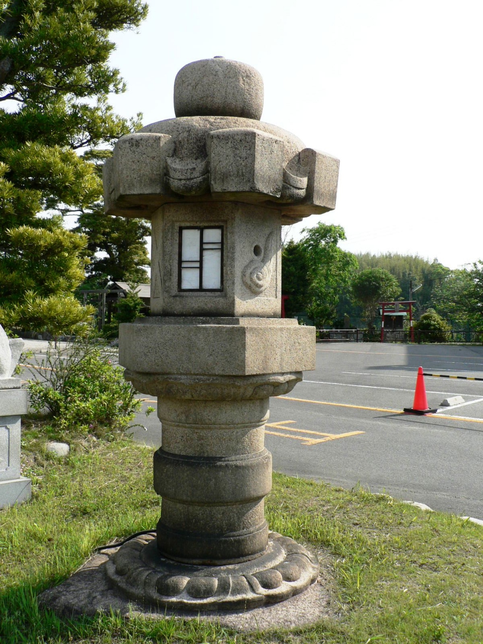 1632年に伊勢津藩の第2代藩主藤堂 高次(とうどう たかつぐ1602−676年)が山城国の愛宕神社の分霊を相殿に勧請し、以来藤堂家代々の帰依があり1873年に村社となつている。白い鳥居に灯籠が左右に並んでいる光景は美しい。説明板によると、これは大平型の龍神灯籠で渡辺龍神氏が村治宮司の懇願により寄進した、かつて福山藩阿部家江戸屋敷にあったものとのこと。