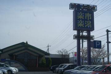 北本駅の東口の駅前の通りを少し南下して、本宿天神社のある交差点を左折して道なりに進み、国道17号線の北本4丁目の交差点から少し大宮寄りに楽市楽湯の看板が見えてきます。駅から徒歩20分ぐらいで、建物の外に煙突があり、入口に銭湯の下足箱、脱衣所のロッカーなど普通の銭湯を改築して、スーパー銭湯にしたようです。料金は700円で、浴室の中にところ狭しと浴槽が並んでいます。