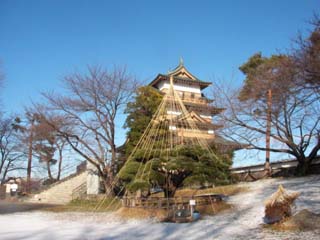上諏訪駅から南に続くけやき並木のあたりの地名は大手で、途中でクランク状に曲がったところが鍵の手で、途中の衣之渡川を渡ったところが三の丸、中門川の先は二の丸で、温泉引かれて古い味噌蔵が並んでいます。本丸に続く堀は凍っていて、小さいながら再建された天守閣に着きました。