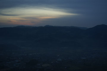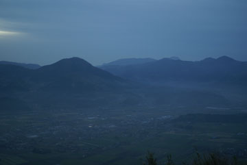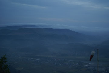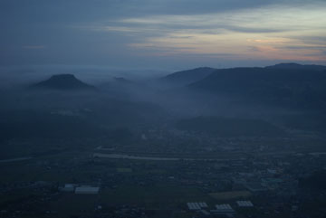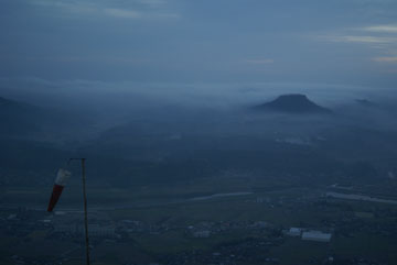 天ヶ瀬温泉に行った次の日は、未明から豊後森に戻って伐株(きりかぶ)山を目指します。山頂へは裏側の鞍部から車道が続いていて、最後は急な坂を上ると山頂の駐車場に着きました。あたりは広い草原になっていて、山頂直下から急な斜面でパラグライダーの離陸場所になっています。足下には、朝霧につつまれた玖珠盆地が良く見えます。