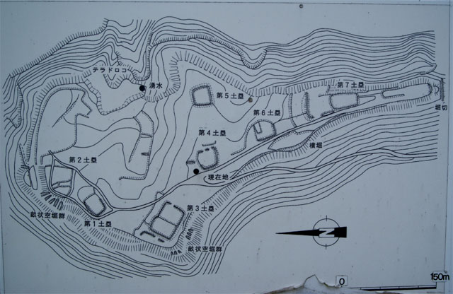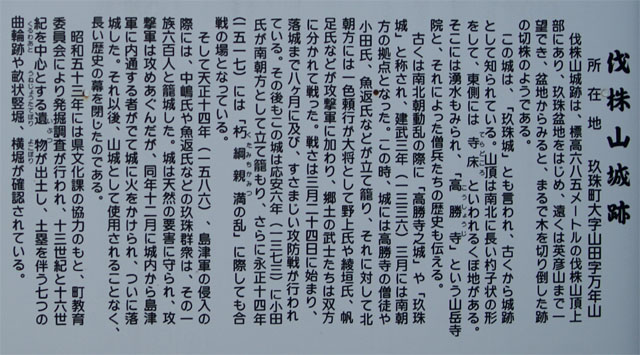 山頂の一角に伐株山城址の看板がり、伐株山が南北朝の頃の山城で、古戦場であったことが分かります。調査による地図では、土塁や空堀の他に、寺があった谷間の寺床(テラドコロ)には、湧水があり、周囲を急な斜面に囲まれた天然の要害の地で、篭城して戦ったことが想像されます。
