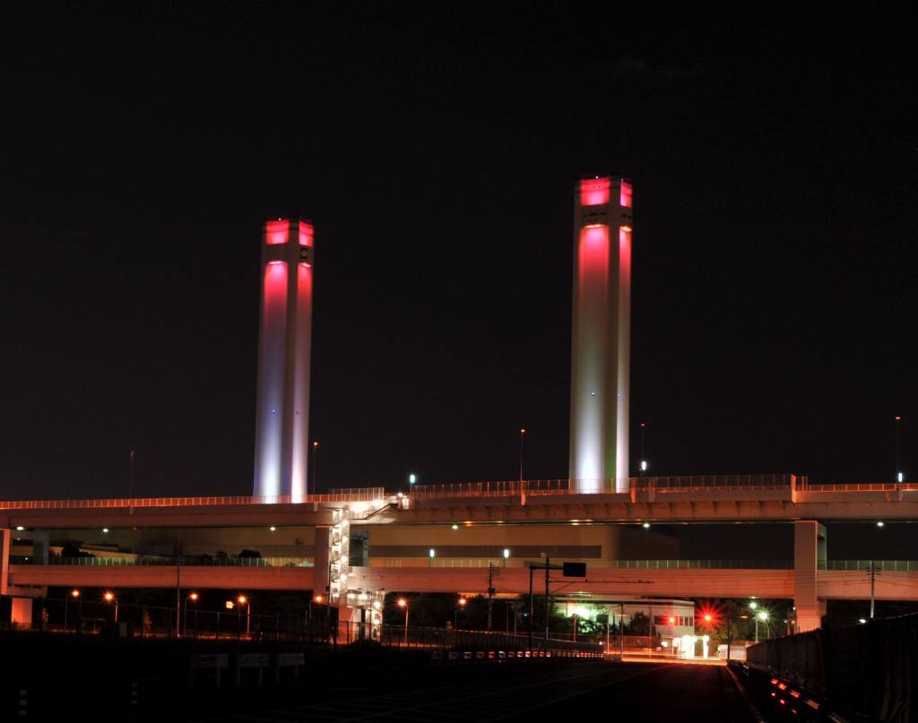 傍には東京電力の火力発電所「ツイニー横浜」があり、その排煙塔が