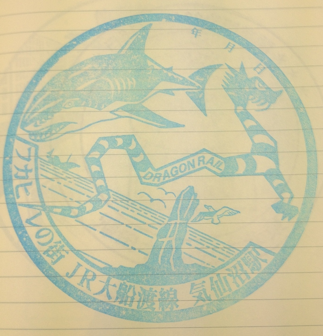 気仙沼駅のスタンプには、「フカヒレの街」と刻印されています。