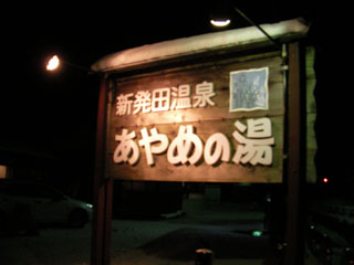 この温泉は普段は10時から営業開始ですが、日曜・祝日に限って6時から営業していて、雪が積もった道を線路沿いに進んで、踏切を渡り住宅地の中を進み、サークルKの前を通って新発田商業高校の先の信号のある交差点を左折すると湯のタンクがありあやめの湯の看板が出ています。玄関前に無料の足湯があり、営業開始直後で近所の人が車でやってきています。