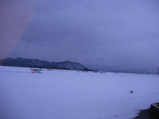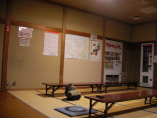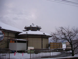 湯上りに隣にある休憩室に寄ってみると、温泉の裏側は一面の雪景色で、暖房が効いています。さらに廊下の先には、食べ物の持込が出来る別の休憩室があり、近所の人の集会場になっていて料金も安くていい施設です。循環バスもありますが、本数が少なく、休日は運休なので、帰りも雪道を20分ぐらい歩いて新発田駅に戻りました。