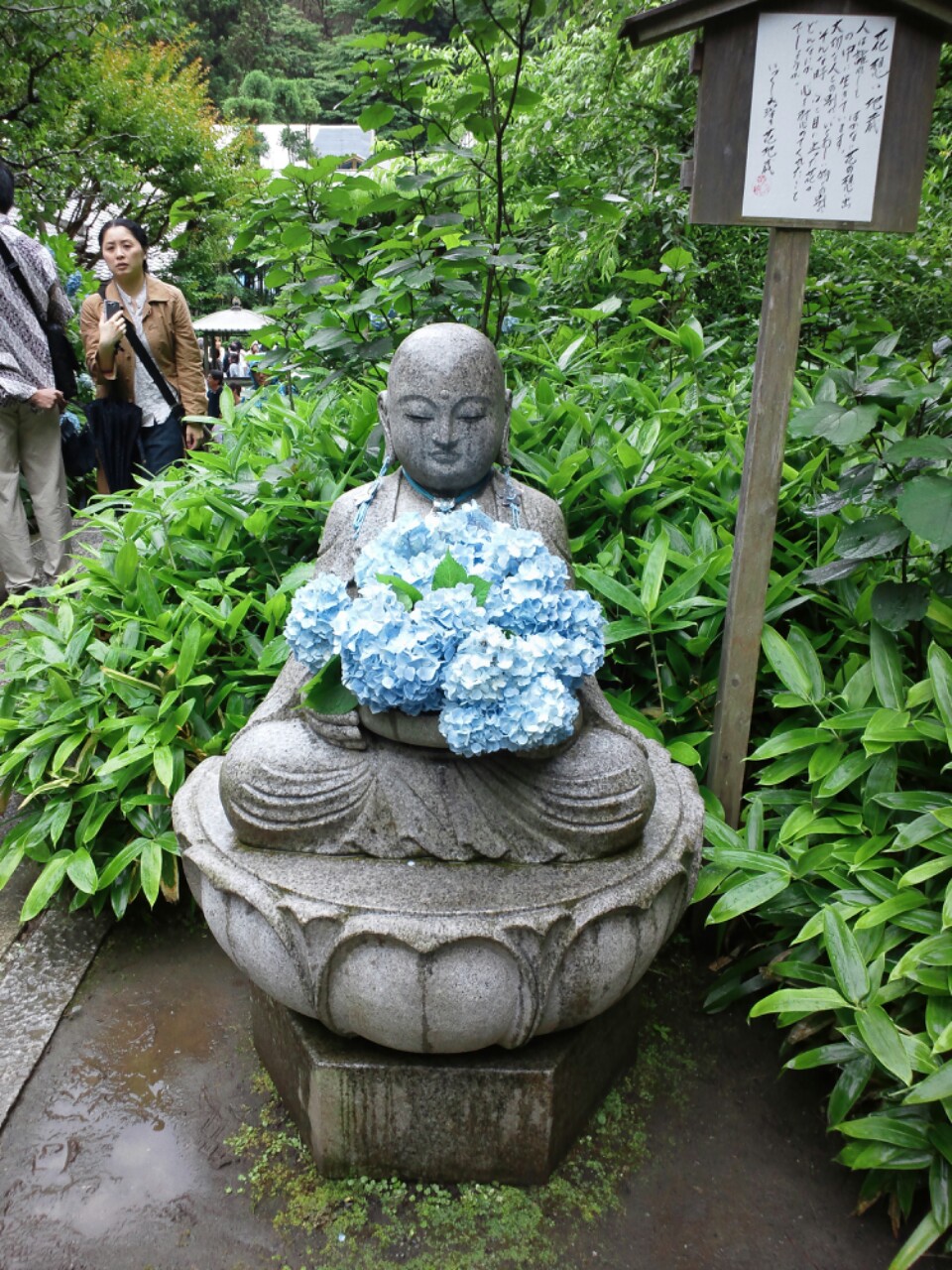 紫陽花を見に、雨の降る土曜日午前中に行きました。雨だから傘が邪魔で、大勢の人の傘で紫陽花が見えずらい・・・。雨に濡れる紫陽花はすごくきれいでしたが、有名な山門付近では完璧に傘を見に来た状態になってしまい、雨の日の明月院は避けたいですね。紫陽花の時期だけ拝観料500円となる商売根性抜群のお寺です!団体客も多いので、タイミングが悪いと、入園するのに、待たされることになります。何年か前に、閉園ギリギリに行った時は、ゆっくりできないけど、少しだけ混雑緩和でした。