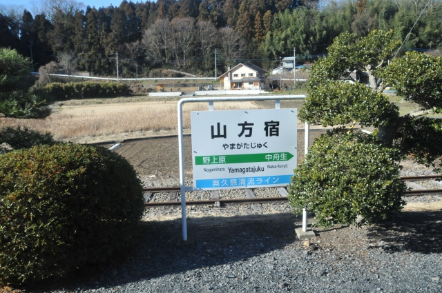 茨城県常陸大宮市山方にある、JR東日本の水郡線の駅です。相対式ホーム2面2線の駅で、天井のとんがり屋根が印象的なモダンな駅舎があります。駅舎内には公民館と図書館が併設されていました。駅周辺は人家が多いです。