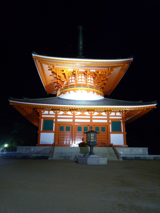 高野山の金剛峯寺などがあるメインのエリアにある壇上伽藍。そこで、朱色に美しく輝くのが根本大塔。この見所は、青空に映える朱色もいいですが、夜にライトアップされた大塔。観光客も少ないですし、静かな高野山を満喫できます。