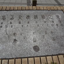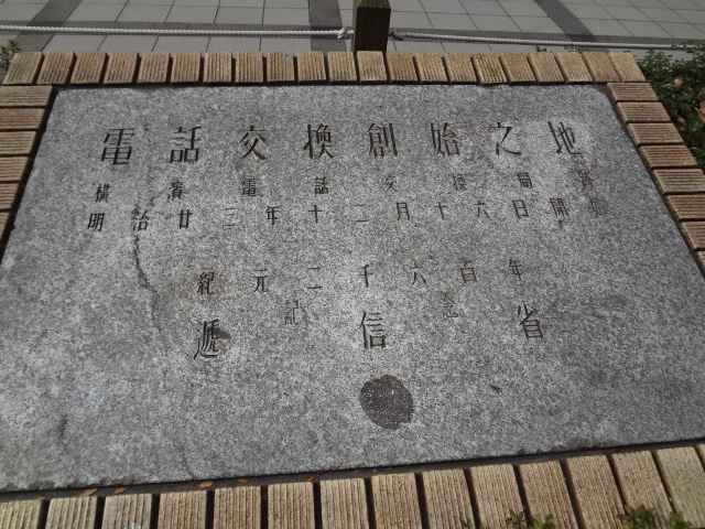 横浜港郵便局の県庁とは反対側のビルの敷地内、大桟橋通り沿いにあります。明治23年に 東京・横浜市内と 横浜と東京間で電話交換が開始されたのを記念して、昭和12年に作られた碑です。これと同様のの碑が 東京の丸ノ内にも設置されています。