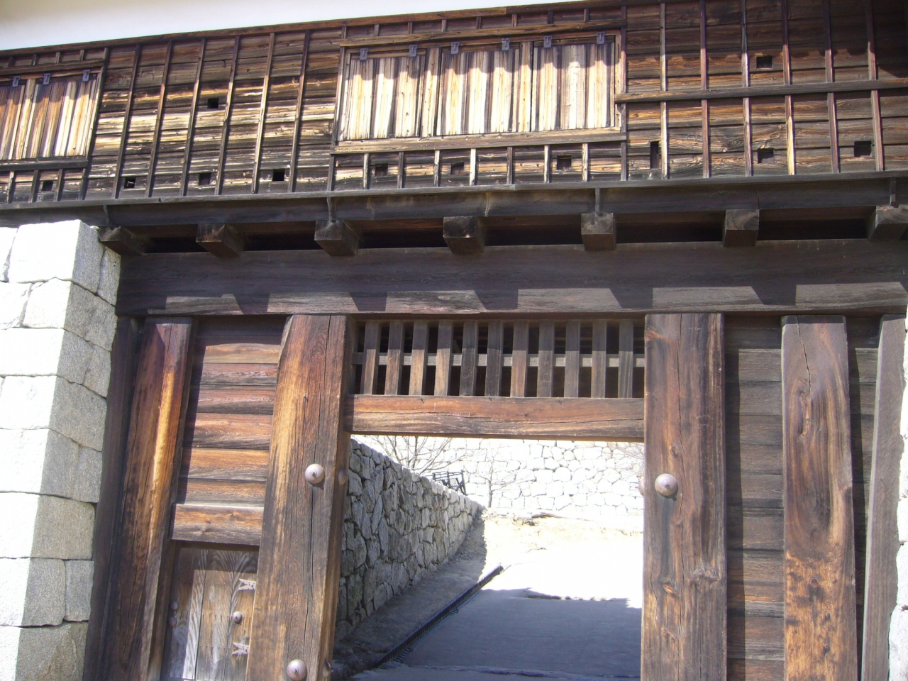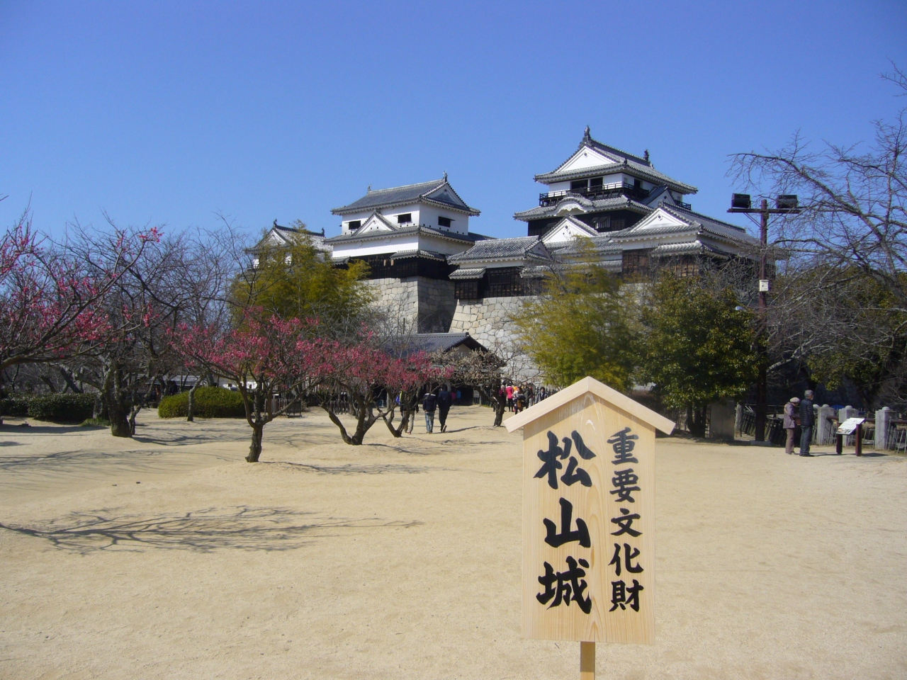 松山城に行く途中の通り沿いにたくさんのお土産屋さんが並んでいる。この土産屋をのぞきながら進んでいくと、松山城へのロープウェイがある。が歩いていくことにした。長い階段を上がると東雲神社があり、さらに登っていくと松山城がある。松山城からの眺めは最高。城の中は急な階段になっており、中には刀や兜の展示物がある。