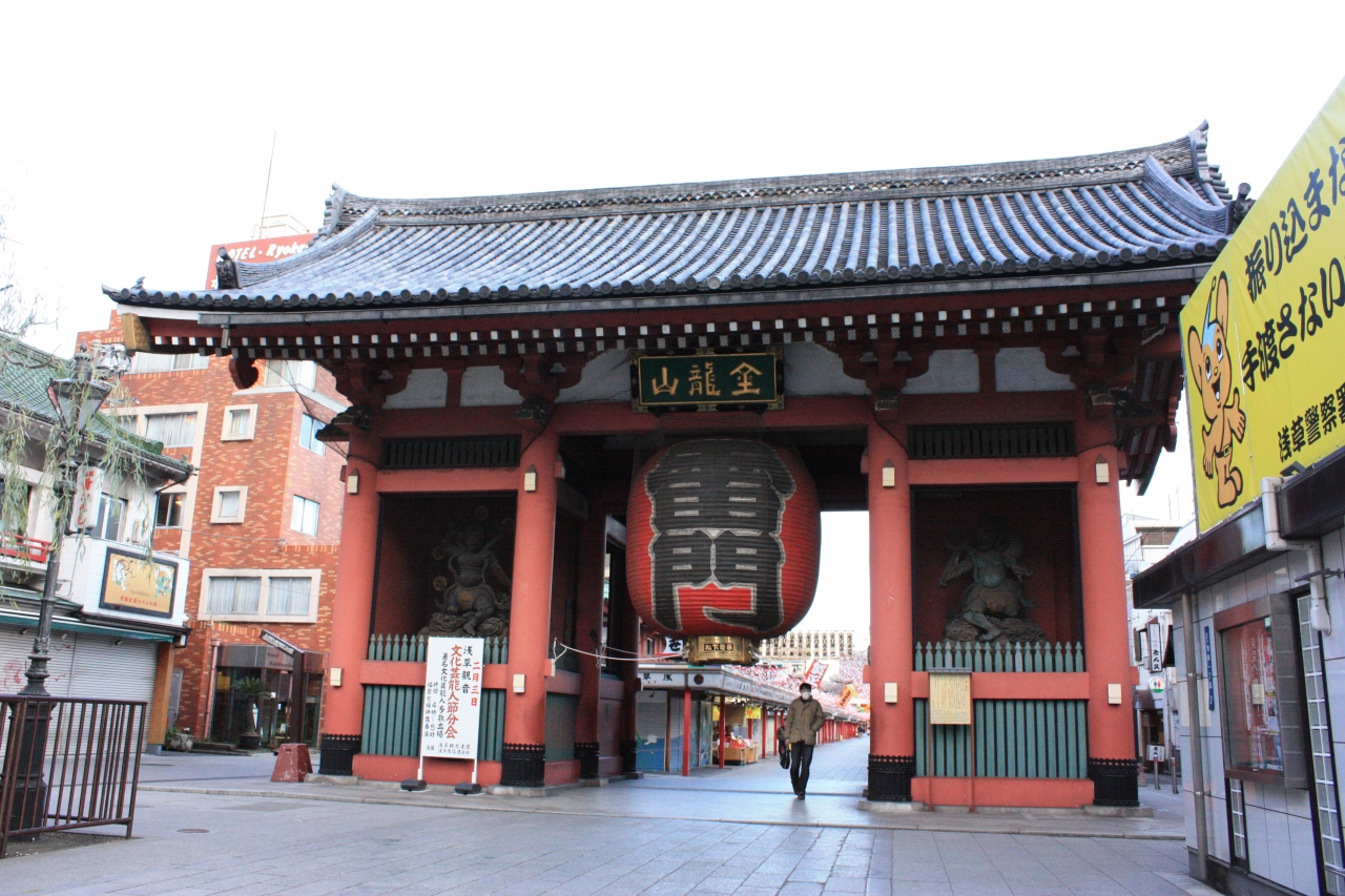 門に向かって、右側に風神、左側に雷神が配されています。門の中央には、強烈なインパクトの重さ約700Kgのデカ提灯が吊りさげられています。浅草のランドマークで、外国人には日本を象徴する風景として有名です。