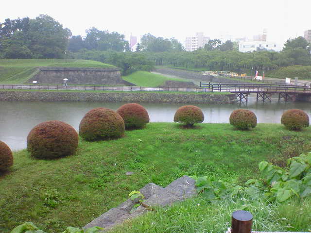 きれいな星型で有名な五稜郭ですが、地上を歩いてみると緑の多い庭園という感じで、小高い丘に上がると、整然と掘られた外堀や角ばった縁などに、星型の片鱗を確かめることができます。