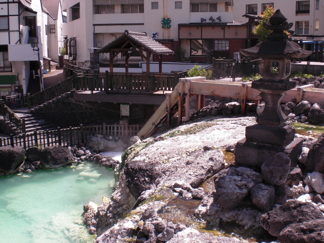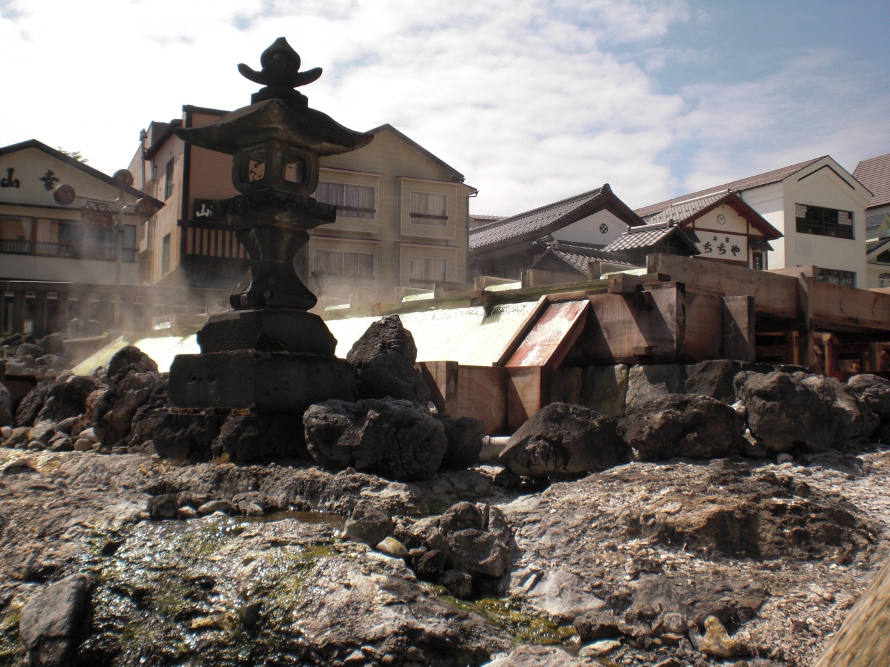 周囲は宿・土産屋・飲食屋が立ち並び、温泉街の雰囲気満点です。