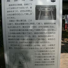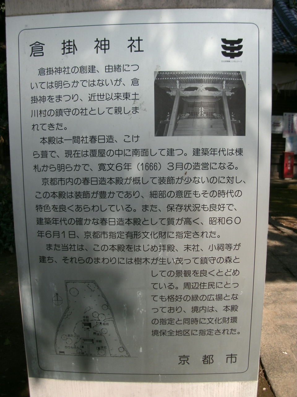 「倉掛神社」は、国道171号線、東土川の信号を東に100mほど入ったところにあります。本殿は一間社春日造、こけら葺で建築年代は棟札から寛文6年3月の造営です。境内には本殿をはじめ拝殿、末社、小祠等が建ち、それらのまわりには樹木が生い茂って鎮守の森としての景観を良くとどめていることから、境内は本殿の指定と同時に京都市の文化財環境保全地区に指定されています。