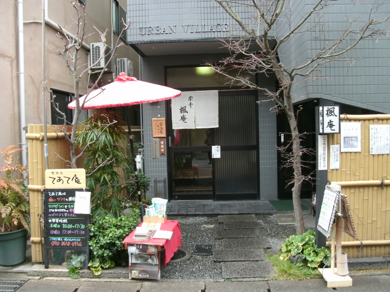 「楓庵」さんは、阪急長岡天神駅西口を出て、アゼリア通りを超えてみずほ銀行と阪急京都線線路の間の小道を少し行くと左手にあります。一見、普通の民家の様な佇まいですが、小さな前庭に床机と傘が飾られています。日本茶やぜんざい等の甘味や雑炊などが頂けるお店です。特に、日本茶は抹茶から玉露、ほうじ茶まで日本茶インストラクターの女将さんが入れてくれる本格的なもので、部屋の雰囲気と相まって、ゆったりとした気持ちで頂けることが出来ます。他には無い雰囲気を持ったお店なので、ホッコリしたい気持ちになったときに是非訪ねてみて下さい。