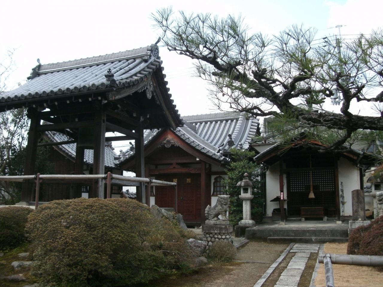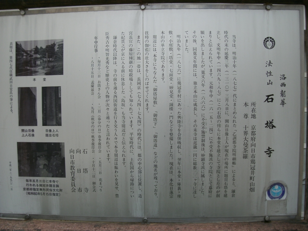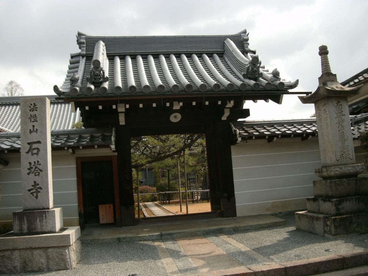 「石塔寺」は、物集女街道の五辻の信号から、一筋東の旧西国街道沿を200mほど南にいったところにあります。静かな住宅街にあり、小さいながらも厳かな構えのお寺さんで、日蓮宗の単立本山になっています。鎌倉時代末期の延慶3年(1310年)に日像聖人がここに題目石塔を建てたことが始まりで、後に伽藍を整えて今の寺名になったそうです。静かな境内は松と石畳の整った庭が印象的でした。ここは、毎年5月3日の花祭りで京都府無形民俗文化財の“鶏冠井(かいで)題目踊り”が行われることでも知られています。