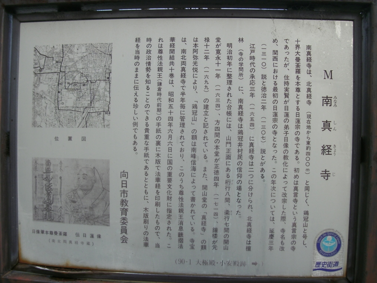 「南真経寺」は、阪急西向日駅の北西500mたらず、府道67号線(西国街道)の五辻の信号の近くにあります。日蓮宗の寺院で、鎌倉時代末期に、日像上人の布教により村人のすべてが日蓮宗に改宗した信仰の中心地。もとは南真経寺と北真経寺は一つの寺で、現在の北真経寺の位置にあったが、壇林の開校にともなって現在の場所に移された。江戸時代初期に建立の本殿や開山堂は、京都府の文化財に指定されています。