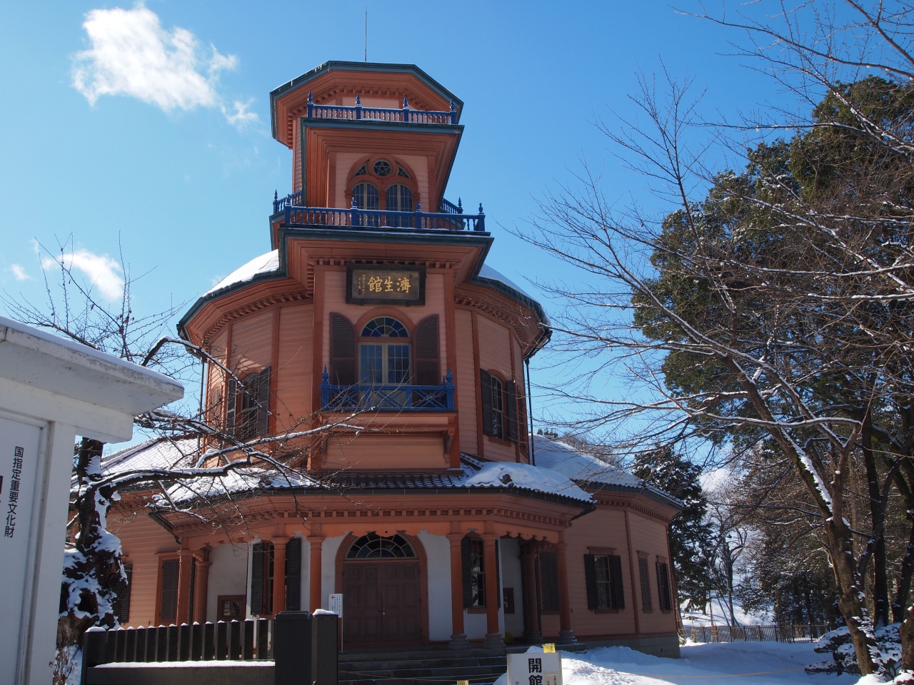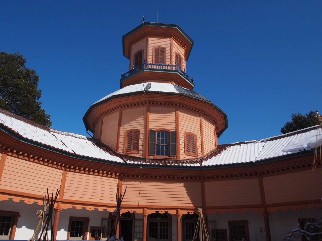 明治11年に建てられた木造の三層楼16角形の建築物で中庭もあります。