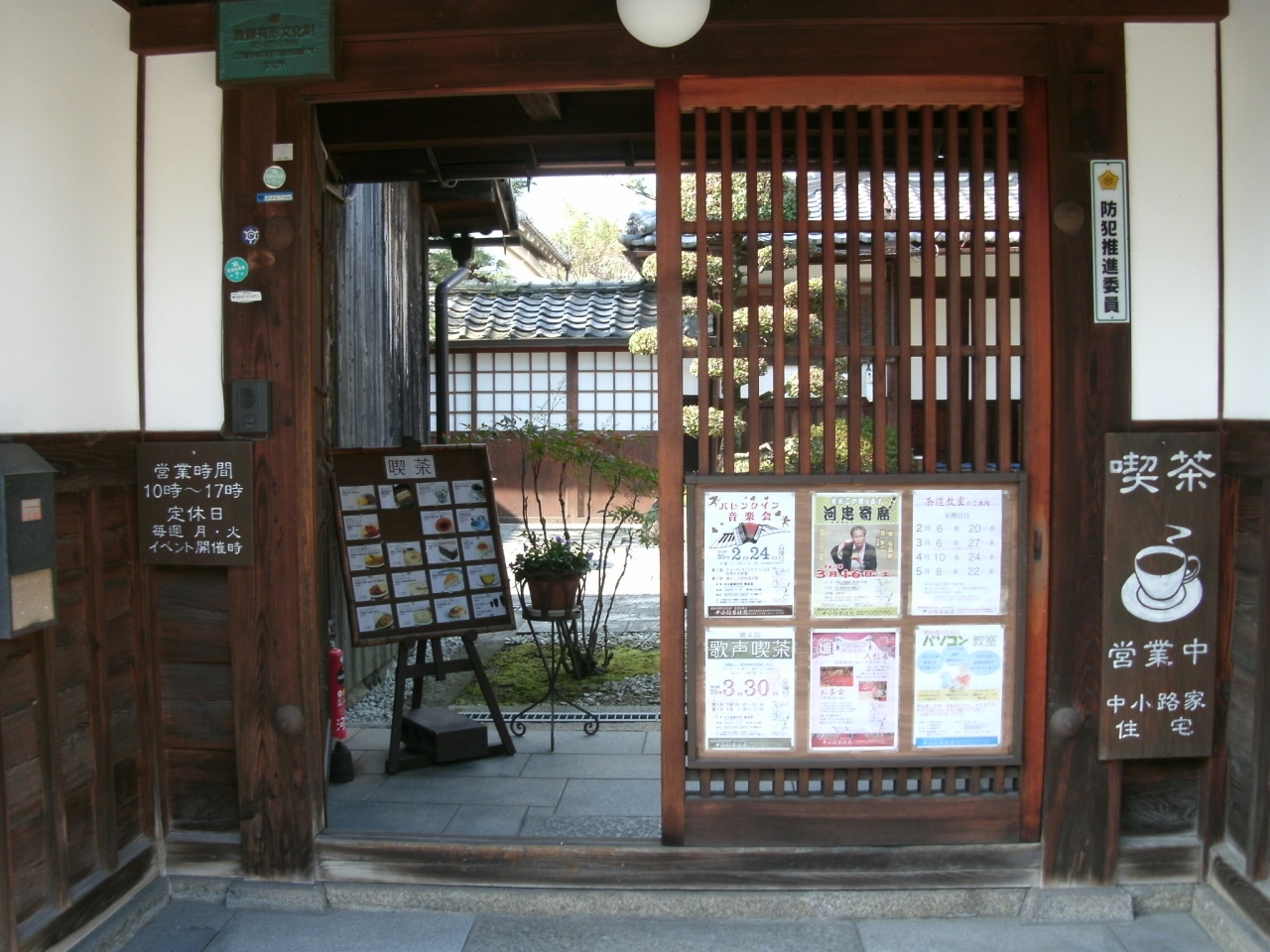 「中小路家住宅」は、阪急西向日駅の南西、約500m、西国街道に沿った江戸時代に建てられた住宅です。敷地中央北寄りに建つ主屋に、上質なつくりの座敷を備えた大きな民家で、2008年に国の登録有形文化財に指定されています。ここは、コンサートや寄席などのイベントが開催されることがありますが、それらの開催が無いときはカフェとして営業されています。靴を脱いで母屋に上がると、内部は古いお宅のリビングにお邪魔している感じで、ゆったりとした気分でコヒーやケーキ、ランチを頂くことが出来ます。なかなか、味わうことが出来ない隠れ家的な雰囲気を持っている場所なので、是非、訊ねられることをお奨めします。