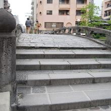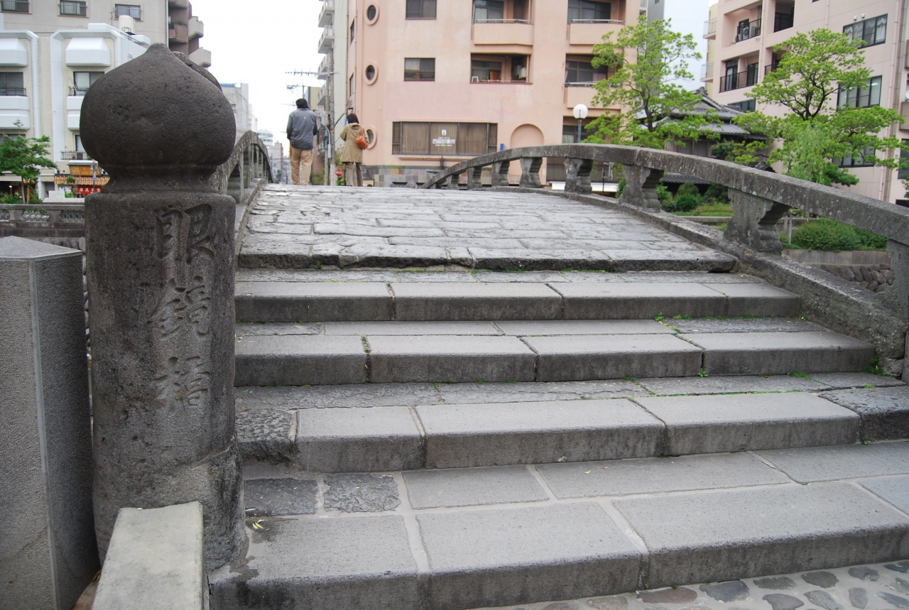 中島川石橋群の中では唯一の双円アーチ型で、水に映った姿が眼鏡のように見えるためこの名が付いています。