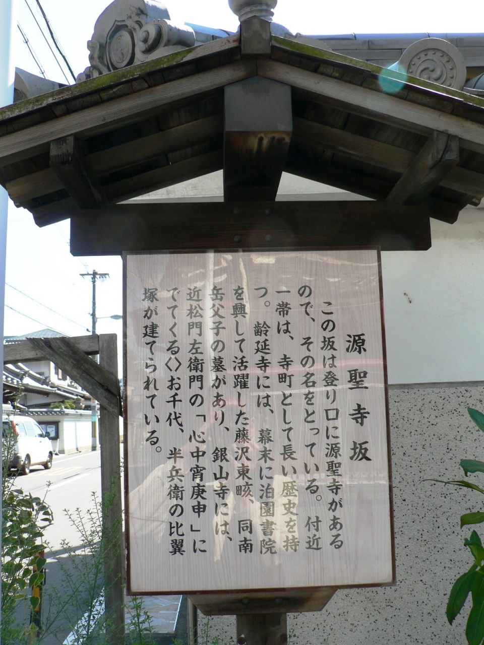 源聖寺坂(げんしょうじざか)は坂の上り口北側に源聖寺があることに由来し、石段を上りきった場所に昭和末期までコンニャク好きの狸を祀る「源九郎稲荷」があったとのこと。